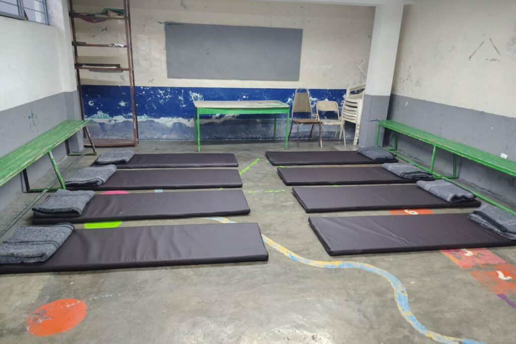 Albergue temporal habilitado en el Gimnasio de San José para personas en situación de calle.